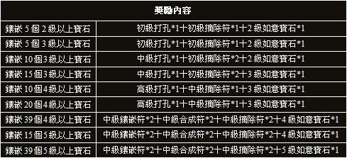 活動內容:鑲嵌寶石可以大幅提高玩家戰鬥力,玩家擁有更多寶石時可以把寶石無損拆除出來合成更高級的寶石。在活動時間內達到指定寶石鑲嵌目標的玩家可以獲得豐厚獎勵。