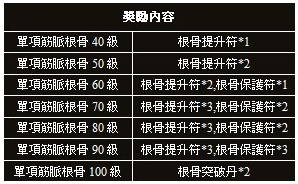 活動內容:在活動時間內,提升根骨到達指定級別便會獲得超值獎勵。