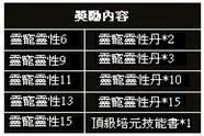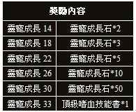 活動內容:提升成長可以大幅提高靈寵屬性,成長達到一定數值還能獲得額外的屬性獎勵和靈寵技能空格。在活動時間內達到指定靈寵成長目標的玩家可以獲得豐厚獎勵。