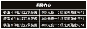 活動內容:活動期間,玩家只需收集並裝備一定數量的的四象紫色防具套裝即可獲得元寶獎勵,達成要求後可在開服活動介面點擊領取。