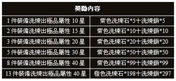 活動內容:攻擊和暴擊(武器飾品)、生命和堅韌(裝備)為裝備中最為極品的屬性,可以用洗煉鎖對高星的極品屬性進行鎖定後繼續洗煉,不但可以擁有原來的極品屬性,還有機會洗煉出新的極品屬性!在活動時間內洗煉出指定數量極品屬性(攻擊和暴擊、生命和堅韌)的玩家可以獲得豐厚獎勵。
