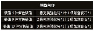 活動內容:紫色裝備為前期最好的裝備,擁有紫色裝備可以助您橫掃副本。紫裝可以通過進階、熔煉、精煉進一步打造為更極品裝備!在活動時間內收集並裝備指定數量紫色裝備的玩家可以獲得豐厚獎勵。