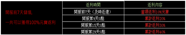 活動內容:開服後7天內,任意儲值都可以獲得額外100%儲值元寶返利!其中及時返利10%,