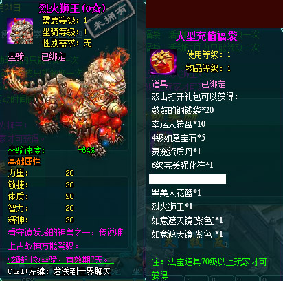 溫馨提示: 1,大型儲值福袋內含超炫時效坐騎:烈火獅王; 2,儲值禮包中的法寶道具僅70級以上玩家才可獲得。