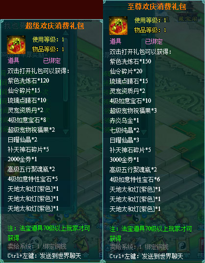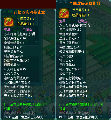 1, 歡慶消費禮包中的法寶道具等級70級以上玩家才可獲得。
