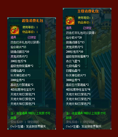 1, 消費禮包中的法寶道具等級70級以上玩家才可獲得。