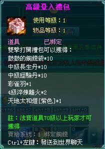 活動時間:2013年9月30日~2013年10月6日 活動內容: 連續登錄開獎,累計登入禮包 35級以上的玩家只要每天登入遊戲即可獲得豐厚獎勵,登錄天數越多,獎勵越豐厚。 1.連續登錄1天,可獲得1次抽獎翻牌機會; 2.連續登錄2天,可獲得2次抽獎翻牌機會; 3.連續登錄3天,可獲得3次抽獎翻牌機會;(每日最多可獲得3次) 中途中斷則重新開始計算 1.累計登錄2天可獲得初級登入禮包 2.累計登錄5天可獲得中級登入禮包 3.累計登錄7天可獲得高級登入禮包