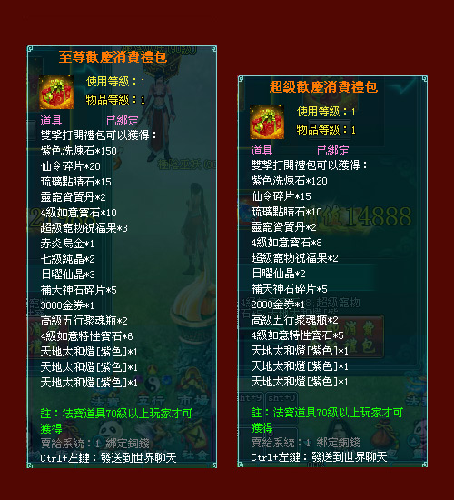 1, 消費禮包中的法寶道具等級70級以上玩家才可獲得。