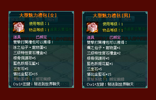 1、以上禮包中的物品除了寵物蛋外,其他全為綁定不可交易。