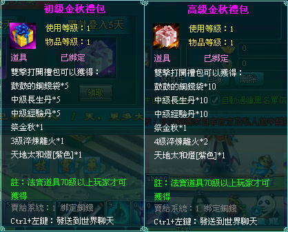 連續登入開獎,累計登入禮包 35級以上的玩家只要每天登入遊戲即可獲得豐厚獎勵,登入天數越多,獎勵越豐厚。 1.連續登入1天,可獲得1次抽獎翻牌機會; 2.連續登錄2天,可獲得2次抽獎翻牌機會; 3.連續登錄3天,可獲得3次抽獎翻牌機會;(每日最多可獲得3次) 中途中斷則重新開始計算 1.累計登入2天可獲得初級金秋禮包 2.累計登錄5天可獲得中級金秋禮包 3.累計登錄7天可獲得高級金秋禮包 溫馨提示: 1.每天登錄都可以翻牌,最多可翻牌三次; 2.累計登錄一定天數即可領取禮包