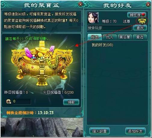等級達到40級後即可開啟聚寶盆功能。每個玩家擁有自己的聚寶盆,每天可以對不同的好友聚寶盆進行一次祝福,同時自己的聚寶盆可以接受好友的祝福。聚寶盆的當天累積的祝福值在次日00:00-23:59內可以兌換成綁定銅幣獎勵。祝福值不同,獎勵不同。