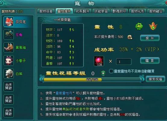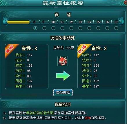 4. 特有祝福等級系統,當提升失敗導致靈性值低於祝福值時,可以通過接受祝福,不消耗寵物靈性丹恢復相應的靈性值。