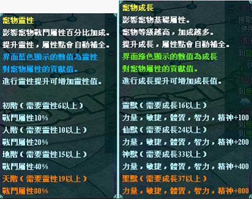 1. 靈性:根據靈寵靈性的等級,分為初階、人階、地階、天階,可分別獲得額外10%、20%、40%、80%的屬性加成;