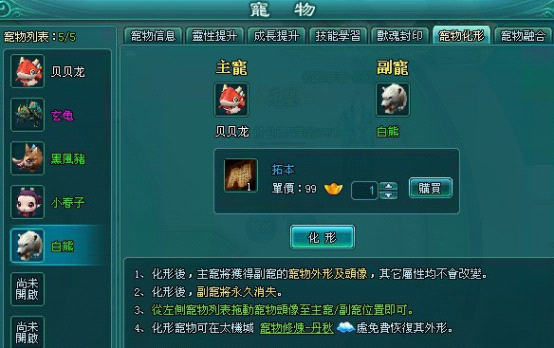 化形規則:1) 化形需要1個主寵和1個副寵,等級不限,每次化形消耗1個拓本;2) 化形後主寵將永久獲得副寵的外形和頭像,主寵屬性不會改變;3) 化形後副寵永久消失。