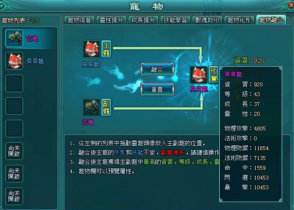融合規則:1)靈寵融合需要一隻主寵與一隻副寵進行融合,融合後副寵消失,消失後不可恢復;2)融合後獲得的靈寵將擁有主寵的外形和技能;3)融合後獲得的靈寵將獲得主副寵中最高的資質、等級、成長、靈性;4)在預覽中可以查看融合的結果;5)靈寵融合後不可逆操作。