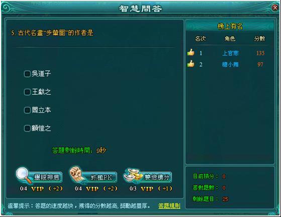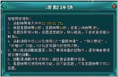 參與要求:玩家等級≥30。 開放時間:每天中午12:15開放,所有線上的玩家都可以通過點擊“智慧答題”參加。