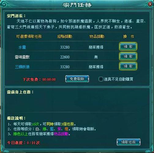 接取方式:前往太機城宗門道長(144•58)處領取任務。1) 每天可領取10次任務,最多可同時領取3個;2) 領取和刷新都能改變可選任務的顏色,越高級任務獎勵越豐富;3) 完成綠色以上等級的任務,除了豐厚經驗之外,更有幾率獲得商城道具獎勵。